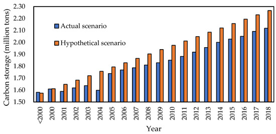 In the past 20 years, the actual storage decreased only slightly in 2001 and 2004 and showed a fluctuating growth in the other years (Figure 10). The overall carbon storage gradually increased from 1.58 million tons to 2.12 million tons. The carbon storage increased by 0.54 million tons in the past 20 years, with an average annual growth rate of 2.69 × 104 t/a, while under the hypothetical no-rubber-planting scenario, the overall carbon storage increased from 1.57 million tons to 2.27 million tons, and the carbon storage increased by 0.69 million tons over the past 20 years, with an annual average growth rate of 3.46 × 104 t/a. Comparison between the actual planting and the hypothetical no-rubber-planting scenarios indicated that rubber plantations caused a decrease in carbon storage in all years except 1999 and 2000, and the difference between the actual and the hypothetical carbon storage reached −0.15 million tons in 2018.