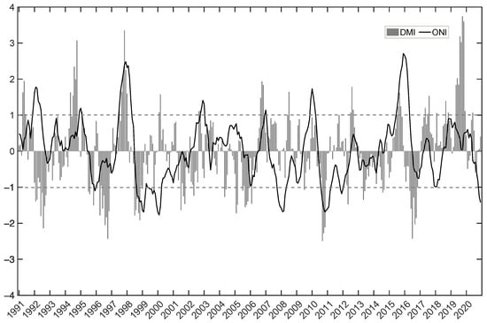 Dipole Mode Index (DMI) time series (gray bar) and Niño 3.4 index (ONI) time series (black line).