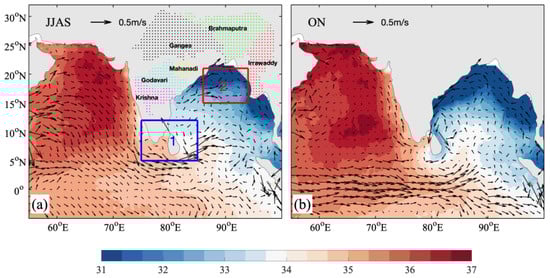 Composites of the distribution of SMOS sea surface salinity (shaded; psu) and OSCAR currents (vectors; m/s) (a) from June to September, (b) in October and November for 2010–2019. The blue box indicates region 1 around Sri Lanka (75–85°E, 5–12°N), and the red box indicates region 2 in the northern BoB (86–94°E, 15–21°N). The distribution of rivers is marked with dots (red, green, white, yellow, blue, and pink represent Irrawaddy, Brahmaputra, Ganges, Mahanadi, Godavari, and Krishna, respectively).