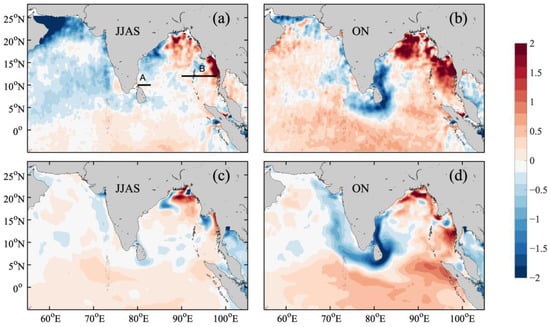 Sea surface salinity anomalies of SMOS (a,b) and ORAS5 (c,d) in 2010 relative to the mean for the period 2010–2019. The lines in (a) indicate section A (80–83°E, 10°N) and section B (90–98°E, 12°N).