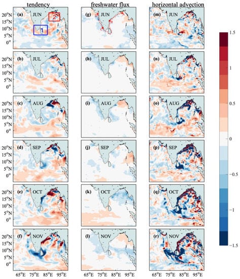 Monthly mixed layer anomalous salt budget in 2010 (shaded; psu/month), including the tendency term (a–f), anomalous local freshwater flux term (g–l) and horizonal advection term (m–r). The blue box indicates region 1 around Sri Lanka (75–85°E, 5–12°N), and the red box indicates region 2 in the northern BoB (86–94°E, 15–21°N). The red dots in (g) indicate the track of low-salinity water.