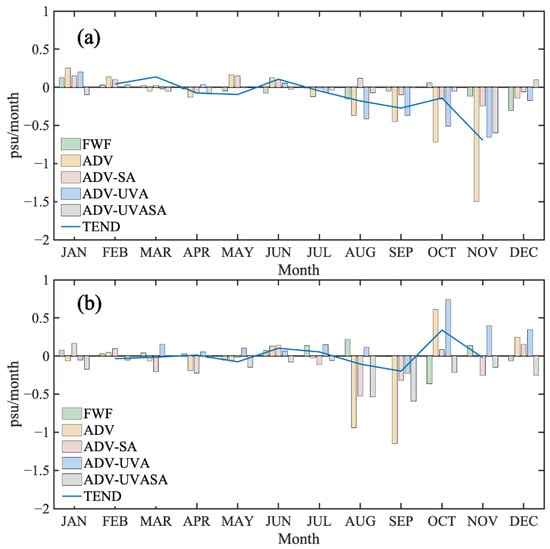 where overbar terms represent the climatological mean seasonal cycle and primed terms represent anomalies. S and are the mixed layer salinity and sea surface salinity, respectively. The variable h is the MLD, and u (v) is the mixed layer zonal (meridional) current velocity. E is evaporation, and P is precipitation. The values of h, S, , and u (v) are from ORAS5, while E and P are from ERA5. The residual R represents physical processes such as runoff and vertical mixing that cannot be estimated directly. The terms in Equation (1) from left to right are the anomalous salinity tendency, anomalous sea surface freshwater flux of the climatological salinity, zonal advection of anomalous salinity by the climatological current, meridional advection of anomalous salinity by the climatological current, zonal advection of climatological salinity by the anomalous current, meridional advection of climatological salinity by the anomalous current, zonal advection of anomalous salinity by the anomalous current, meridional advection of anomalous salinity by the anomalous current, and residual term. The horizontal advection of anomalous salinity by the climatological current is ADV-SA =; the horizontal advection of climatological salinity by the anomalous current is ADV-UVA =; and the horizontal advection of anomalous salinity by the anomalous current is ADV-UVASA =. The horizontal advection term contains ADV-SA, ADV-UVA, and ADV-UVASA. We used the anomalous mixed layer salt budget to analyze the contribution of horizontal advection and freshwater flux to SSS variability.