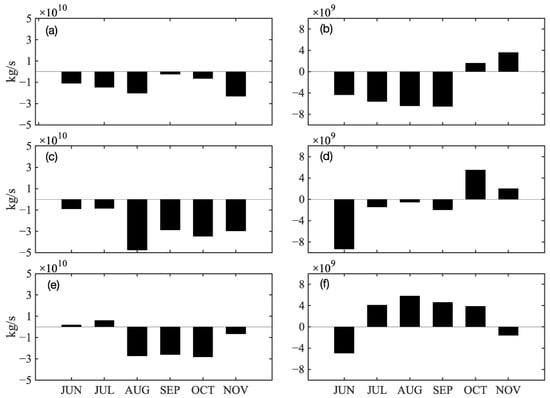 The freshwater transport in section A (80–83°E, 10°N; a,c,e) and salinity transport in section B (90–98°E, 12°N; b,d,f) marked in Figure 3 from June to November. The panels from top to bottom correspond to the climatological transports, transports in 2010 and anomalous transports in 2010 (the second panel minus the first panel).
