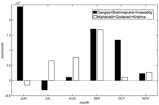 The anomalous runoff along the west (white bars) and north (dark bars) coast of the BoB from June to November 2010.