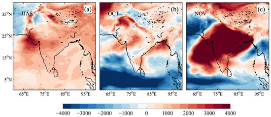 Moist static energy anomalies at 850 hPa (shaded; J/kg) (a) from June to September, (b) in October, (c) in November in 2010 based on ERA5 data.