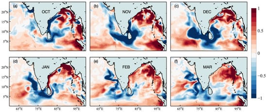 The negative salinity tendency around Sri Lanka in autumn 2010 probably influenced the formation of the Arabian Sea Mini Warm Pool (ASMWP) in the spring of 2011, which was associated with Indian summer monsoon in 2011. From November 2010 to February 2011, the freshwater around Sri Lanka was transported to the southeastern AS (SEAS) by the west Indian coastal current (WICC) and mostly trapped in an anticyclonic eddy, strengthening the salinity stratification there (Figure 13c). Figure 13 presents the anomalies of salinity difference between the surface and 50 m and confirms the strong salinity stratification in the SEAS. The strong salinity stratification (Figure 13) was characterized by a shallow MLD. In addition, the westward downwelling Rossby waves triggered by coastal downwelling Kelvin waves gave rise to an anticyclonic eddy circulation known as the “Lakshadweep high (LH)”, which deepened the isothermal layer [47,48]. As a result, a thick barrier layer developed and reduced the heat exchange between the mixed layer and thermocline, which paved the way for the formation of the ASMWP in the following spring [49]. Furthermore, the thermal inversions embedded within the barrier layer also contributed to the formation of the ASMWP [50,51]. The ASMWP is located in the southeastern Arabian Sea (SEAS; 4–14°N, 68–78°E) and characterized by a sea surface temperature (SST) exceeding 30.25 °C [52]. The ASWMP is built up in March and dissipates in May [53]. With the light wind and clear sky in March, increased solar radiation influx is trapped in the thin mixed layer [50,54], resulting in rapid SST increases and the formation of the ASMWP [55].