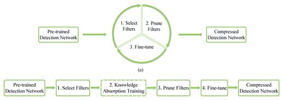 To obtain lightweight remote sensing object detection neural networks, we propose a network pruning method that takes into account the characteristics of remote sensing objects, which we call absorption pruning. Our previous work has shown that, as an anchor-free end-to-end differentiable object detection network, CenterNet is more effective in remote sensing object detection tasks than other detection networks []. Therefore, we take CenterNet as the pre-trained network for the absorption pruning method. The absorption pruning method is designed as a four-stage pruning method, as shown in Figure 1b. First, the absorption pruning method selects filters that are easily absorbed from the pre-trained network, according to the filter selection criteria proposed in this paper. Second, the knowledge absorption training algorithm designed in this paper smoothly transfers the “knowledge” of the selected filters to the rest of the network. Third, the selected filters are removed from the network. Fourth, fine-tuning is conducted to recover the network performance. Finally, the absorption pruning method outputs a light object detection network. In this process, according to the characteristics of remote sensing objects and the characteristics of the deep neural network feature extractor, we design a pruning ratio adjustment method to allow the absorption pruning method to better adapt to the remote sensing object detection task.