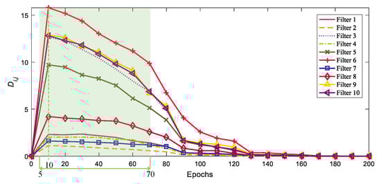 Figure 2 contains two essential pieces of information: first, all filter parameters were initialized very well. The initialized filter parameters were very close to the optimized parameters (i.e., the values of all filters are close to 0). The second is that the direction of the minimum gradient of the filter parameters during the training process was not consistent with the direction of the shortest distance (the lower curve is closer to the shortest distance than the upper curve). Therefore, we realized that this phenomenon can be used to measure the learning difficulty of filter parameters in order to construct a simple and unique filter selection criterion. Specifically, only the model at a certain stage and the final model need to be stored. Then, the value of for each filter is obtained according to Equation (1). A larger indicates that the filter is more challenging to learn. In addition, it can be seen, from Figure 2, that when the epoch is within the interval (5, 70), the convergence distance curves of different filters have obvious differences and rarely cross. Thus, when training the pre-trained network, we only save the and the final converged model parameters to evaluate the filter absorption difficulty and select the filter from the converged pre-trained network according to the absorption difficulty score.