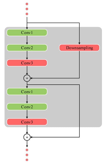 The ResNet structure network usually consists of multiple convolution blocks, as shown in Figure 4. In order to avoid the trouble of pruning filters in down-sampling layers, traditional pruning algorithms usually only prune the convolution layers shown in green []. The absorption pruning algorithm proposed in this paper also includes the red convolutional layers in the pruning range. The specific approach is as follows: treat the red convolutional layers in each convolutional block as a convolutional layer, and these layers share the same sequence of filter learning difficulty. In the filter selection stage, the learning difficulty score of each filter in the red layer is calculated as follows: