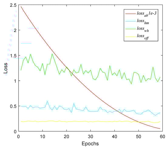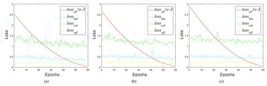 Figure 6 shows the change curves of the loss function during absorption training. According to the analysis of Equation (3) in Section 3.3, the , , and are indicators of network detection performance, while indicates how much the selected filters contribute to the network. As shown in Figure 6, during the absorption training process, decreased rapidly while , , and only fluctuated within a small range. These results indicate that the selected filters rapidly lost their effect while the network performance was almost unchanged. It appears that the rest of the network absorbed the knowledge in the selected filters. It is worth mentioning that, in order to clearly show the changes in the four losses in the same figure, was multiplied by a factor of 1 × 10−3.