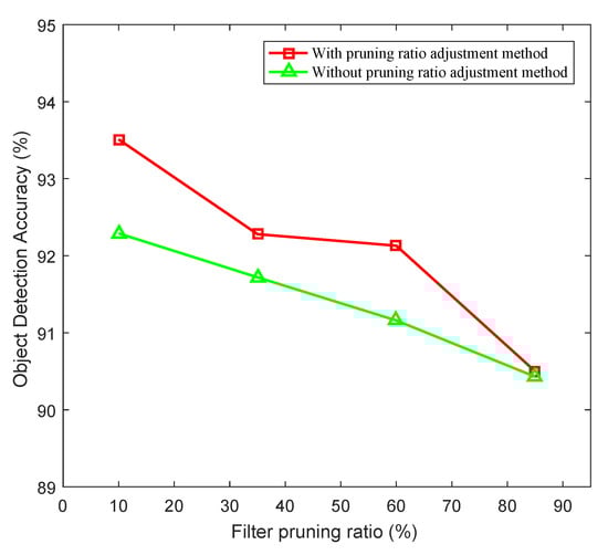 Experiments were also carried out to verify the effectiveness of the proposed pruning ratio adjustment method. The CenterNet101 trained on the SSDD data set was again used as the test object. The pre-trained CenterNet101 underwent absorption training, pruning, and fine-tuning with and without the pruning ratio adjustment method, and finally, lightweight compressed networks were obtained. Figure 8 depicts the performance of the compressed networks with and without the pruning ratio adjustment method at different pruning ratios. It can be seen that the pruning ratio adjustment method specially designed for remote sensing image object detection enhanced the absorption pruning method. By analyzing the number of filters in each layer of the compressed networks obtained with and without absorption pruning, we observed that the method for the pruning ratio adjustment proposed in this paper can, indeed, help absorption pruning to focus on pruning top convolutional layers and reduce the pruning of bottom convolutional layers.