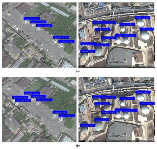 Comparison of object detection results between pre-trained network and pruned lightweight network on RSOD data set: (a) object detection results for the pre-trained network, and (b) object detection results for the pruned lightweight network.