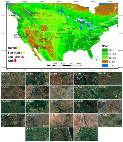 A total of 23 flux tower stations in different regions with various land covers, climate and topographic conditions (Table 1 and Figure 1) and a total of 2270 Landsat images were used for model evaluation. The study areas covered nine main land cover types: cropland (CRO), short vegetation (open shrublands (OSH) and grasslands (GRA)), forest (evergreen needleleaf forests (ENF), deciduous broadleaf forests (DBF), mixed forests (MF), savanna (SAV), and woody savanna (WSA)), and wetland (WET), with a wide range of altitudes from −5 to 3030 m above sea level. The study also considered a wide range of climate conditions: humid subtropical (Cfa: mild with no dry season, hot summer), humid continental (Dfa: humid with severe winter, no dry season, hot summer), Mediterranean (Csa: mild with dry, hot summer), steppe (Bsk: warm winter, Bsh: very cold winter), marine west coast (Cfb: mild with no dry season, warm summer), warm summer continental (Dfb: significant precipitation in all seasons), and subarctic (Dfc: severe winter, cool summer), based on the Köppen classification and the global aridity index. Half-hourly or hourly EC data were obtained from the Ameriflux database (https://ameriflux.lbl.gov/, accessed on 23 March 2022) for ET evaluation. It should be noted that only high-quality EC data for each climate were selected. A total of 3 and 7 flux tower sites were selected for arid and semi-arid climates, respectively. Likewise, 9 and 4 flux tower sites were chosen for humid and sub-humid climates, respectively. Thus, 10 towers corresponded to dry and 13 to wet climatological conditions Finally, the Penman–Monteith equation [23] was used to compute ETr, which was used for instantaneous upscaling to daily ET using air temperature, relative humidity, solar radiation and wind speed input data from the flux towers.