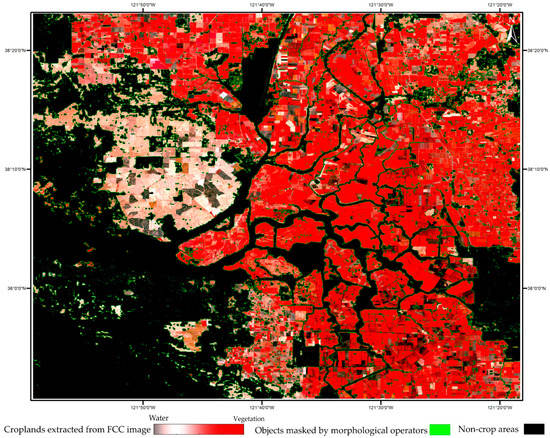 Output when using morphological operators (3 × 3) for the US-TW3 station. This map illustrates the crop class which was extracted from False Color Composite (FCC) imagery and subjected to changes with the morphological functions. The green areas include small polygons, single pixels or misclassification errors, linear objects and polygon margins, diminished by the functions of the WF method.