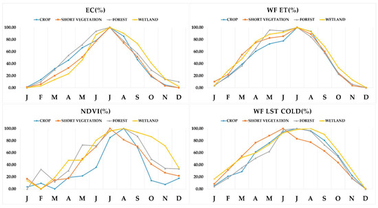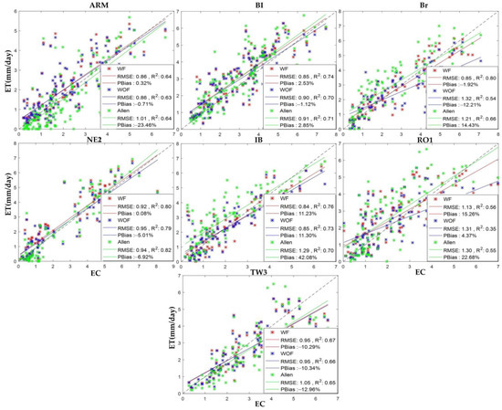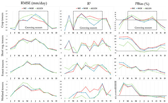 With respect to crop towers, the main difference between WF_RMSE and WOF_RMSE was found from June to October and between WF_RMSE and Allen_RMSE from March to October (during the growing season). In all cases, WF showed the highest agreement with EC data (Figure 6). Moreover, the RMSE results with all the methods behaved similarly across the off-season period. For short vegetation towers, there were two RMSE peaks in July and April with all three approaches. The main R2 difference was found in March when the Allen approach gave slightly better results than WF and WOF. For forest flux towers, all three approaches performed similarly, with the highest RMSE values in May. All three approaches for wetland flux tower sites showed comparable trends, although the Allen approach yielded higher RMSE values from March to July. With respect to the R2 values, the highest correlation was observed in October for the short vegetation and wetland flux tower sites. The months of the growing season with low correlations were July for the short vegetation flux tower sites and August for the other tower sites. An upward trend in correlation was observed from August to October for all scenarios and land covers, except short vegetation. The Allen approach in wetland flux tower sites yielded the lowest R2 with around zero correlation from January to August. The peak correlation values were obtained, for all three approaches, in October for wetland and short vegetation flux tower sites, in March for crop flux tower sites, and in April for forest flux tower sites. Generally, the lowest absolute PBias magnitudes were recorded in June or July months with almost the maximum NDVI or LAI for all approaches. The growing season period between May to October yielded lower PBias (around ±10%) for crop flux tower sites, with zero bias in July for WF. Allen_PBias yielded similar results for crops, forests and wetland flux tower sites but outperformed the other approaches in wetland sites. WF and WOF for short vegetation and forest flux tower sites predominantly tended to overestimate ET (by between 10% and 160%). This tendency to overestimation was also observed for the Allen approach during the whole year at forest flux tower sites and during the first five and last three months of the year at short vegetation flux tower sites. Conversely, there was a tendency at wetland flux tower sites toward overestimation during the first six months of the year and underestimation during the last three. For crop flux tower sites, there was a tendency toward underestimation throughout the off-season period for all three approaches as well as from June to August for the Allen approach and toward overestimation for the rest of the year.
