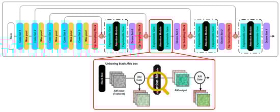 Overall framework of the proposed method. In the decoder part, four attention blocks and eight explainable gates are designed to evaluate the effect of AMs on different backbones and explain their black box.