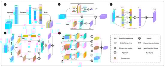SA takes its inspiration from the trinity of SE channel attention, spatial attention from CBAM, and channel grouping from spatial group enhance (SGE). SA, as shown in Figure 2D, is composed of four components: (i) feature grouping, which divides the input tensor into groups along the channel dimension, which is carried out before passing these groups to the attention module (which eventually is split into two branches along the channel dimension); (ii) channel attention, where a GAP is used to reduce the input dimensions to a vector and produces channel attention weights through a gating mechanism; (iii) spatial attention to where the group norm (GN) is used over the input to obtain spatial-wise statistics (ultimately a compact feature representation is created through a gating mechanism, producing spatial attention weights); and (iv) aggregation, in which a channel shuffle strategy is adopted to allow cross-group information flow along the channel dimension.