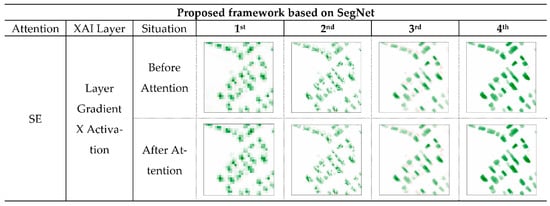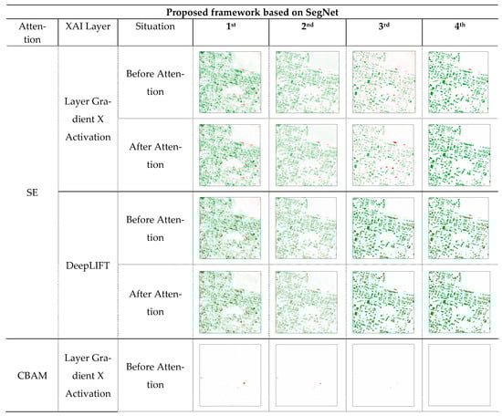 The SegNet-based framework’s attribution visualization is shown in Figure 4. Both layer attributions reveal that SE heavily focuses on the building objects, especially in the last layers where the network is trying to decide. The attribution values also show that SE attempts to distinguish between background and building object in the earlier levels of the attention. Then the network deepens, and we can see a reduction in the influence of the irrelevant objects such as trees and the street as well as other background objects. Also shown is absolute attribution (high response value—dark green) with deeper network depth, which indicates the effectiveness of the SE mechanism.