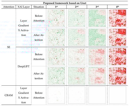 Visualization results of Gradient X Activation and LayerDeepLIFT before and after AMs on SegNet and Unet for WHU dataset. The numbers above the table (i.e., 1st, 2nd…) indicate the layer number of the attention in the framework.