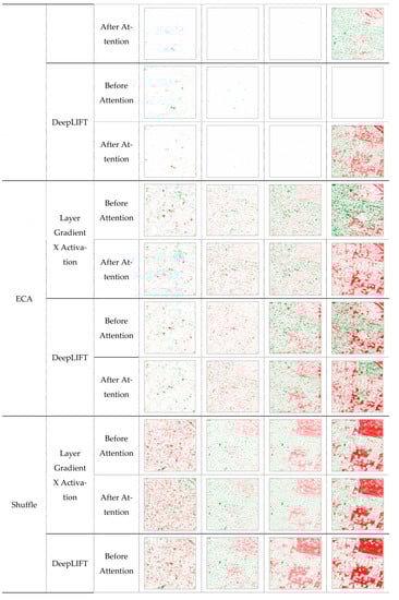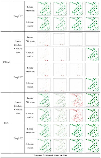 Figure 7 presents the predicted output of Unet’s and LayerDeepLIFT’s visualization of the last layers of the networks. Close observation shows that the vanilla network produces more false positive pixels. However, almost all the attention-based networks perform better and properly delineate non-building objects. Moreover, the higher attribution values of the visualization of LayerDeepLIFT indicate better performance of the attention-based network, especially in the output of the ECA, in which the vanilla network labeled large non-building objects as building, and ECA improve the performance and labeled non-building objects as background.