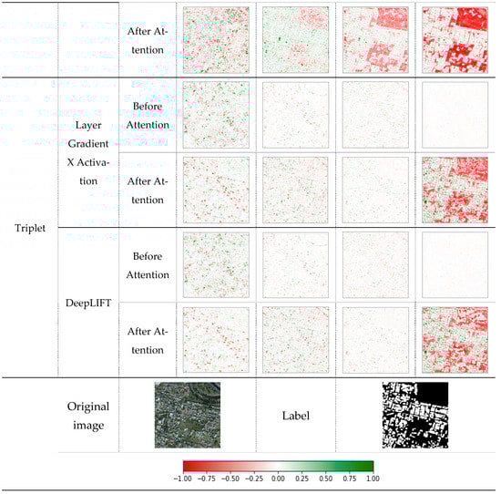 A close look at Figure 6 shows that all predicted outputs of the attention-based networks have better building segmentation results. In certain cases, it is clearly shown in the attribution visualization, that although the buildings are small, the attention-based networks of LayerDeepLIFT of the last layer are still superior in building segmentation compared to the vanilla networks. Comparing LayerDeepLIFT’s visualization of the vanilla and attention-based networks roughly shows that the attention-based networks heavily focus on the small building regions. In addition, some of the detected buildings in the vanilla network are incomplete. Notably, the shape of the detected buildings in the attention-based network has more similarity with the ground truth, especially with regards to the buildings’ boundaries. Moreover, detected buildings in the attention-based network have higher attribution values than the vanilla, which indicates that the AMs motivate the network to concentrate on the buildings.
