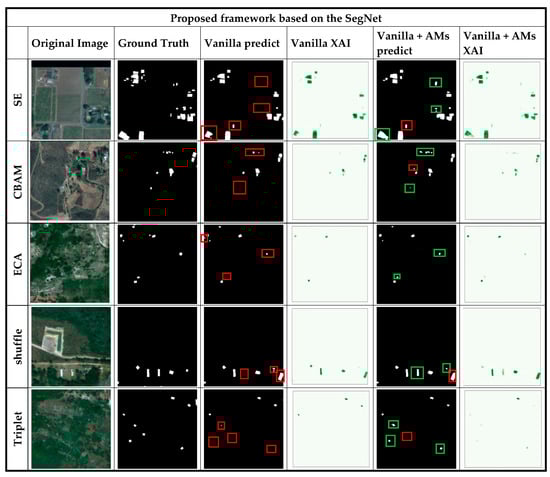 From Table 2, it is clear that the SegNet-based framework with AM showed improvements based on most of the measured metrics, as compared to vanilla. In particular, ECA and CBAM achieved better results compared to other AMs and vanilla. Best improvements in F1-score are by ECA and CBAM, which improved by 1.87% and 1.13%, respectively. In addition, CBAM improved precision by 2.28%. Based on the other metrics, ECA improved the recall by 2.51%, IoU by 2.67%, and OA by 0.19%, respectively.