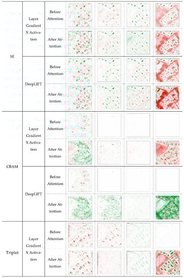 Analysis of the AMs’ effectiveness is performed through attribution visualizations of the XAI methods. Specifically, the feature tensors before and after passing the attention blocks in each layer can be examined. Figure 4 and Figure 5 show attribution visualization results for the AMs based on two-layer attribution models. The visualizations attempt to intuitively demonstrate that pixels (features) with higher attribution are considered “more important” for predicting a class. Basically, more important pixels have a darker shade of green, whereas less important pixels move towards the darker shade of red. To aid understanding, we include an attribution value scale at the base of Figure 4.
