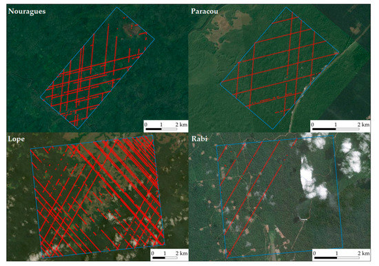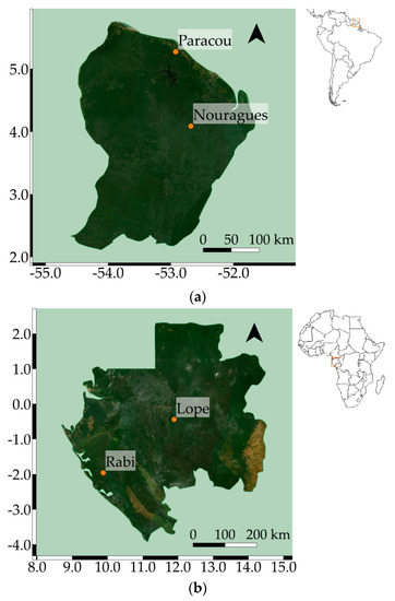 The areas of interest considered in this study have been widely used in other similar works [22,25,26,27] due to the fact that they are specifically protected for research activities and conservation purposes. It can be fairly said that no major impacts or changes caused by anthropogenic activities have occurred recently. Nouragues is an ecological research station operated by the French National Center for Scientific Research (CNRS), and Paracou has been used as a research station to study Amazonian forest ecosystems since 1982. Similarly, Lope is a protected National Park in Gabon and was added to the World Heritage List by UNESCO in 2007. Finally, Rabi Forest Monitoring Plot is part of the Gabon Biodiversity Program and provides data for studies of carbon dynamics and biodiversity.