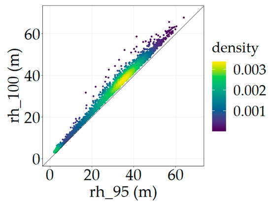 In order to assess the potential of GEDI for the estimation of canopy heights, we firstly decided to use one metric from the L2A product as GEDI-CHM. Among all the available values, we identified two relevant metrics to choose between: rh_100_an or rh_95_an, with n identifying the algorithm setting group (1 to 6). Relative height metrics give the height at which a certain percentile returned energy is reached relative to the ground. For example, rh_100_a5 informs on the height at which 100% of the waveform energy is reached, in the signal processing configuration of algorithm setting group number 5. Relative heights of high percentiles are thus good indicators of canopy heights. Regarding the two specific relative heights that were identified, they are strongly correlated as shown in Figure 3.