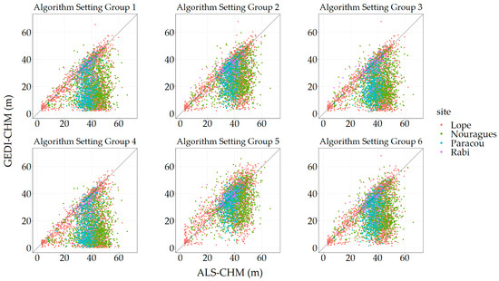 GEDI-CHM estimated from rh_95 as a function of ALS-CHM for each algorithm setting group.