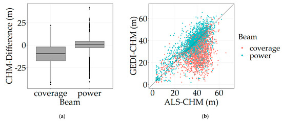 Boxplots in Figure 5a describe the distributions of CHM-Differences depending on beam type. A clear shift in accuracy can be observed with respect to beam type, and it is confirmed by the values reported in Table 4. The median of CHM-Differences from coverage beams is greater in absolute value than the median of CHM-Differences from power beams, the former being at −9.1 m while the latter is at 1.2 m. In addition, CHM-Differences are in general higher in absolute value for footprints acquired through coverage beams (Figure 5a). In a notable way, GEDI coverage beams tend to underestimate CHM, whereas no such observation can be made for power beams.