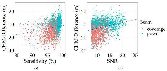Additionally, when considering beam type in this analysis, coverage beams tend to be associated with lower sensitivities and SNR (Figure 6), whereas power beams do not show a tendency to underestimate canopy heights (Figure 5 and Figure 6). The laser power has a direct influence on signal parameters such as sensitivity and SNR, which in turn are decisive for accurate canopy height estimates.