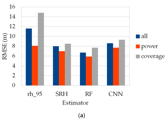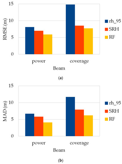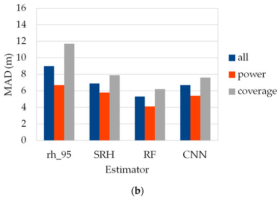 When the analysis is carried out according to beam type, a clear shift in performances is observed between the two laser types. Since algorithm setting group number 5 displays the best performances in GEDI-CHM estimations, further performance analyses in this paper are presented for this specific configuration. Figure 8 shows the RMSE and MAD of GEDI-CHM estimates for the competing estimators depending on the footprints’ beam types. The main result that can be drawn is that power beams generally perform better than coverage for the estimation task regardless of the method used. Moreover, similarly to what was previously observed concerning the model stability in relation to the algorithm setting group, SRH and RF regressors exhibit relatively close performances between power and coverage beams, with RF being the most stable approach once again: the RMSE reaches values of 5.9 and 7.7 m for power and coverage beams, respectively (Figure 8a). Finally, power beams show a relative stability for GEDI-CHM estimations since the results obtained are of similar magnitude regardless of the method used, with RMSE values ranging from 5.9 to 8.1 m (Figure 8a).