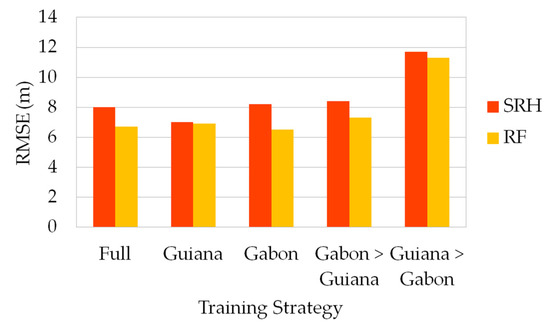 Figure 10 gives a graphical representation of the results reported in Table 5. When considering strategies relying on a 10-fold cross validation (“Full”, “Guiana” and “Gabon”), RF shows significant stability in terms of performances, with identical values of RMSE for each configuration (6.7, 6.9 and 6.5 m, respectively). SRH is more sensitive to the dataset used to build the model but also remains quite stable, with RMSE values ranging from 7.0 to 8.2 m. Regarding strategies that are based on country training (training on one country, validation on the other), they exhibit degraded performances in terms of RMSE, with “Guiana > Gabon” being by far the least interesting approach for both SRH and RF estimators.