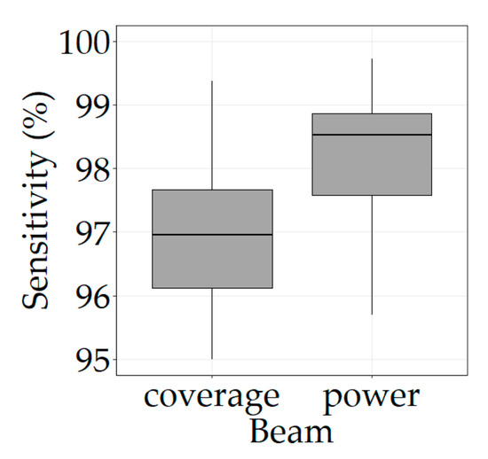 Relation between beam type and beam sensitivity (algorithm setting group number 5). Outliers removed for clarity.