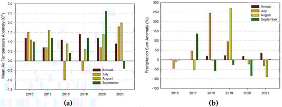 Mean air temperature (a) and precipitation sum (b) anomalies for the period of 2016–2021 on an annual basis and for the summer months (July, August, and September).