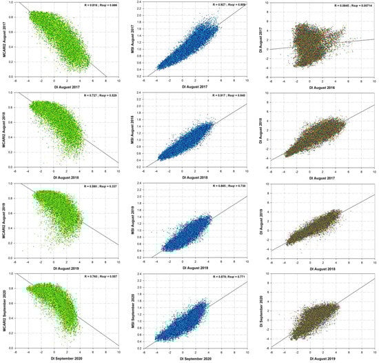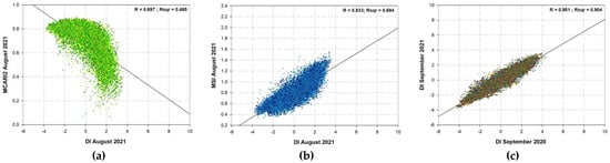 Linear regression analyses between DI and MCARI2 (a); DI and MSI (b); and DIs for two consecutive years (c) for the period between 2017 and 2021.