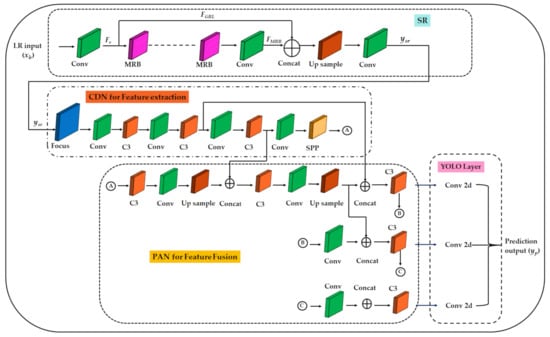 Herein H f e     is the convolution operation for feature extraction of the y s r   through the CSP Net and Darknet, H f f     is the feature fusion of the CDN and PAN, and H Y O L O   is the convolution operation of the head network used to classify the objects in the SR image. The final output of the SRODNet is expressed by Equation (8).