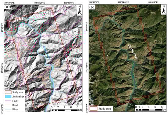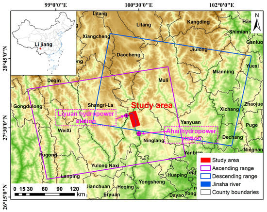 An area measuring approximately 31 km and 14.5 km from north to south and east to west, respectively, was selected to identify, monitor, and analyze landslides. In Figure 1, the red area is the study area, the purple rectangular is the Sentinel-1 ascending coverage, the blue rectangular is the Sentinel-1 descending coverage, and the blue line is part of the Jinsha River basin. The study area is located in the middle of the Hengduan Mountains in northwest China, where the terrain is highest in the northwest and lowest in the southeast (highest and lowest elevations of 4184 m and 1402 m, respectively). The mountains and valleys in the area are narrow, the ravines are interlaced, and the Jinsha River valley is deeply incised [50]. The large differences in the height of the terrain and the steep mountains provide ideal conditions for the occurrence of landslides in the area. The Liyuan and Ahai Hydropower Stations are located in the upper and lower reaches of the Jinsha River Basin above and below the study area, respectively (as shown in Figure 1), and any landslides occurring in the study area potentially threaten the safe operation of these hydropower stations.