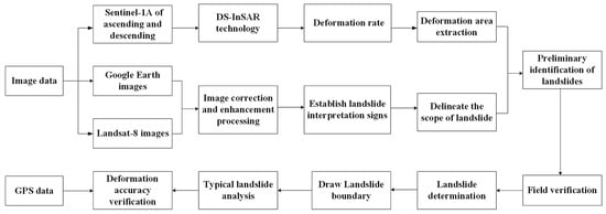A flow chart of the study design is shown in Figure 4. The main technical methods employed included: (1) DS-InSAR to obtain surface deformation information, (2) optical images for conducting visual interpretations, (3) on-site inspection and verification of DS-InSAR and optical image accuracy, and (4) the selection of typical landslides to analyze the temporal and spatial variation characteristics.