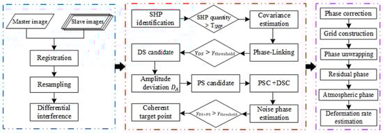 Obtaining high-density point targets in non-urban areas is difficult when using the PS-InSAR method. As it is unable to reflect the overall deformation characteristics of certain study areas, researchers have instead focused on ground objects that have moderate scattering characteristics, such as bare land, desert, and cultivated land. Therefore, the DS-InSAR method is proposed for distributed scatterers (DS) to obtain temporally coherent and spatially continuous ground objects [35]. The core idea of this method is to filter out homogeneous points, optimize the DS phase according to the statistical characteristics of the homogeneous points, reduce the influence of noise on the DS, and combine the DS points and PS for deformation calculation, with the aim of improving non-urban area points and the target density and ultimately to obtain the complete surface deformation range. The DS-InSAR data processing method is shown in Figure 5, in which SHP is a statistically homogeneous pixel, DS is a distributed scatterer, PS is a permanent scatterer, is the threshold value of SHP, is the coherence of distributed scatterers, is the coherence threshold, and is the coherence of both distributed scatterers and permanent scatterers. PSC and DSC represent permanent scatterer candidates and distributed scatterer candidates, respectively.
