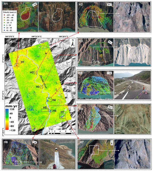 Figure 7 shows the deformation rate in the line of sight (LOS) direction of Sentinel-1A ascending data during the monitoring period. Positive values in the graph indicate motion close to the satellite, and negative values indicate motion away from the satellite. As the study area is located in an area with high mountains and deep canyons, the geometric distortion is severe. Therefore, the subsidence and uplift of the ground surface cannot be obtained simply by using the positive and negative deformation values; the area comprises deformation regardless of whether the deformation value is positive or negative. A total of seven deformation areas were detected from the ascending data, and these were numbered H1–H7. Of these, three relatively obvious areas were located on the east side of the Jinsha River Basin. The maximum deformation rate of 128 mm/yr occurred at H7. However, only a few deformation points were detected in the four areas located on the west side of the Jinsha River Basin. Figure 8 shows the deformation rates in the LOS direction of Sentinel-1A descending data during monitoring. A total of six deformation areas were detected in the descending data, which were numbered H8–H13. The maximum deformation occurred at H8, and the maximum deformation rate was determined as −113 mm/yr. The combined information obtained from optical images and field verification results confirmed that these deformation areas were landslides.