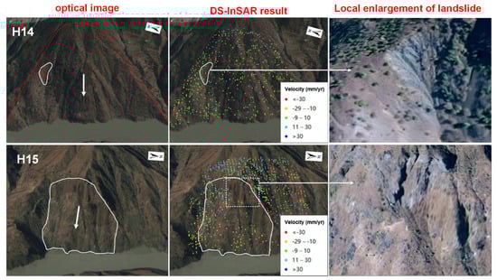 Due to the influence of vegetation coverage and the geometric distortion of SAR imaging, it was difficult to completely identify landslide hazards in the study area using DS-InSAR technology alone. Therefore, a remote sensing interpretation of landslides identified using DS-InSAR technology was conducted using Google Earth images and Landsat-8 images. In doing so, two newly discovered landslides were identified and numbered H14 and H15, respectively (Figure 9). Compared with the DS-InSAR results, no obvious deformation phenomena were found in these two landslides.