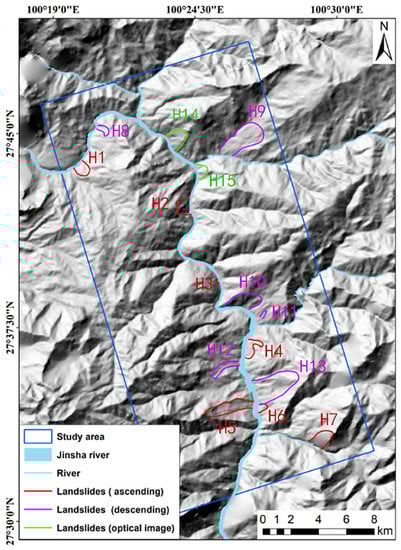 The DS-InSAR deformation analysis results, optical image remote sensing interpretation results, and on-site verification results were combined, and a total of 15 landslide hazards were finally identified in the study area. The distribution of landslide hazards is shown in Figure 10. Of these, H1–H7 were landslide hazards identified using ascending Sentinel-1A data (a total of 7), H8–H13 were landslide hazards identified using descending Sentinel-1A data (a total of 6), and two landslide hazards (H14–H15) were identified via remote sensing interpretation of optical images. Based on the identification results, the landslide identification rate of the ascending track Sentinel-1A data in the study area was 47%, that of the descending track Sentinel-1A data was 40%, and that of the combined ascending track Sentinel-1A data was 87%. The above analysis shows that it is difficult to comprehensively identify landslide hazards in alpine and canyon valley areas using SAR data from a single track. The combined monitoring method using ascending and descending data and DS-InSAR technology effectively improved the identification rate of landslide hazards.