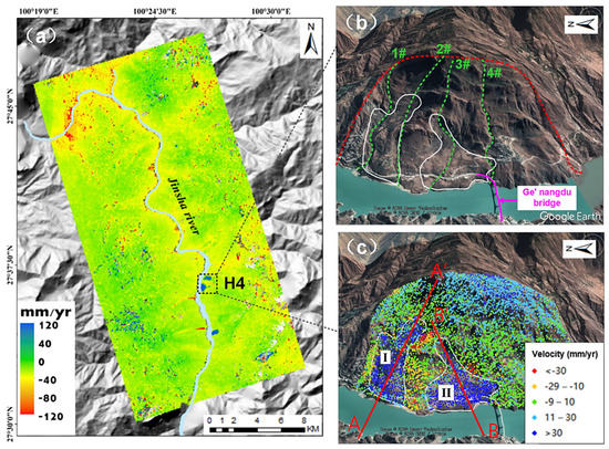 Deformation rate of the XJ landslide mass obtained using DS-InSAR technology and a corresponding optical image. (a) is the deformation rate of DS-InSAR, (b) is the location of cracks 1#, 2#, 3# and 4#, and (c) is the local enlarged view of H4.