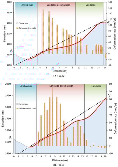 To further analyze the spatiotemporal characteristics of XJ landslide deformation, section lines A-A’ and B-B’ were drawn along the sliding direction on deformation zones I and II, respectively (Figure 11c). Figure 12a,b show the deformation rate values on the section lines A-A’ and B-B’, respectively. As shown in the figure, the maximum deformation rates of deformation zones I and II are both located at the bottom of the landslide (landslide accumulation). The maximum deformation rate on the A-A’ section line is 158 mm/yr, and that on the B-B’ section line is 78 mm/yr. The deformation rate at the top of the landslide and at the sliding position is relatively small.