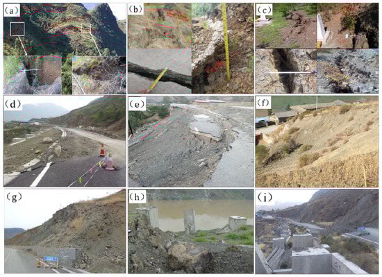 Field investigations revealed multiple macroscopic deformation phenomena associated with the XJ landslide. Large-scale vertical dislocations are apparent at the top of the landslide, and the damage is reflected in the concave shape, which comprises multiple landslide steps. Numerous tension cracks can also be seen within the landslide body. The width of one seam is approximately 10 cm, and the staggered stage is approximately 15 cm, whereas the other part of the seam is approximately 30 cm wide, and the staggered stage is approximately 50 cm (Figure 14a–c). There are obvious cracks and deformation marks in the road pavement at the bottom of the landslide body, and the road edge has collapsed, which seriously affects driving conditions (Figure 14d,e). Dozens of residential buildings still stand on the landslide body, and obvious landslide traces are evident around the buildings (Figure 14f). The continuous deformation of the landslide poses a serious threat to these buildings. The Genandu Bridge is also located at the bottom of Deformation zone II. This bridge is an important passage connecting the east and west banks of the Jinsha River Basin. The stone piers at the eastern end of the bridge and the local area of the bridge are skewed and damaged to varying degrees (Figure 14g–i), which seriously affects their use and function.
