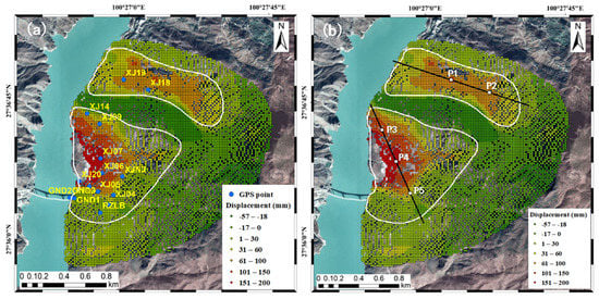 The XJ landslide (H4) is shown in Figure 15, where the measured GPS data were used to verify the accuracy of the DS-InSAR monitoring results of the landslide body. Sixteen GPS monitoring points are located in this typical landslide, and the distribution of the location of each GPS monitoring point is shown in Figure 15a. In the verification process, GPS monitoring reference points were used, and the nearest neighbor search method was employed to obtain the DS-InSAR measurement point closest to each GPS point. A comparative analysis was then conducted.