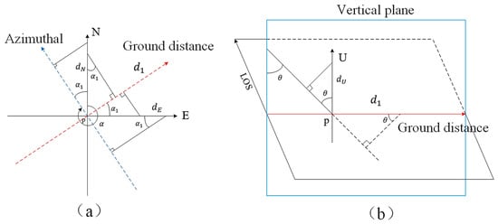 Deformation projection geometry. (a) shows the azimuthal and geodetic projection of the satellite, (b) shows the line-of-sight projection of the satellite.