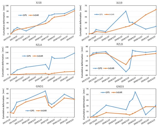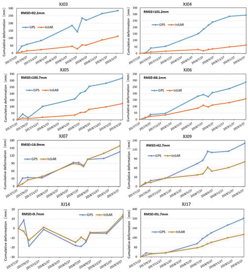 Through projection transformation processing, the GPS line-of-sight deformation value was obtained at the same time as that in the SAR image, and the results were compared at 14 points, including XJ03, XJ04, XJ05, XJ06, XJ07, XJ09, XJ14, XJ17, XJ18, XJ19, RZLA, RZLB, GND1, and GND3, as shown in Figure 17. In theory, the values of the two should be equal. As shown in Figure 17, the time-series of cumulative deformation obtained by the two methods was highly consistent. However, when the amount of deformation was large, the projection value of GPS was several times higher than that of DS-InSAR. This shows that the accuracy of the DS-InSAR results was seriously impacted, and this occurred for the following main reasons: first, a certain deviation occurred between the two due to temporal and spatial differences and the calculation methods employed. Second, the surface deformation along the LOS direction during the two radar observations exceeded the monitoring range of the radar wave, namely (the Sentinel-1 data in this experiment are C-band radar, ) and an interference fringe . However, the time deformation laws presented by the two were consistent, which did not affect the analysis of the settlement mechanism. Nevertheless, when the deformation rate was small, the agreement between the two results was relatively high. For example, the cumulative deformation at points XJ07, XJ14, XJ18, XJ18, RZLB, GND1, and GND3 was within 100 mm, and the corresponding root mean square error (RMSE) between the two was within 20 mm, which is consistent with the theory. When the deformation gradient was small, the phase gradient of the pixels in the adjacent two-scene images did not exceed the maximum detectable deformation gradient limit value. In addition, the deformation value obtained by DS-InSAR was relatively close to the measured GPS value.